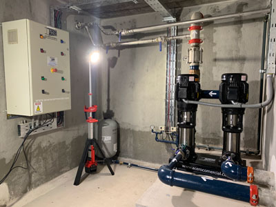 Los sistemas de presión constante instalados constan de 2 bombas CR15-5 GRUNDFOS de 10HP para cada sistema, acompañados de Tableros de automatización y control idónea con un variador de frecuencia por cada bomba y los accesorios y válvulas adecuados.