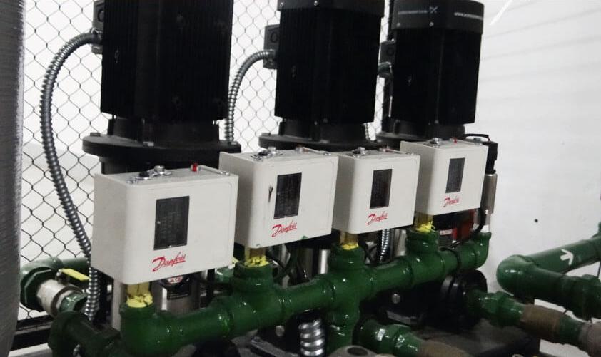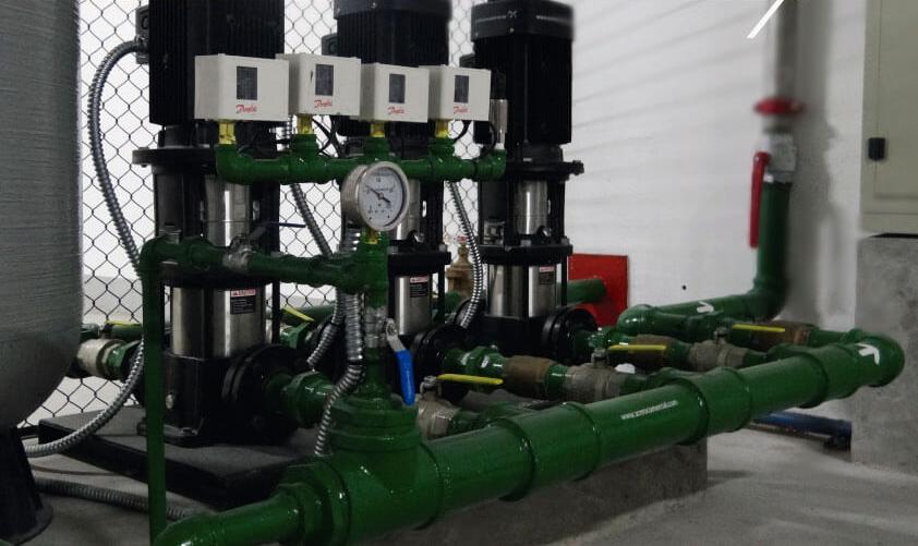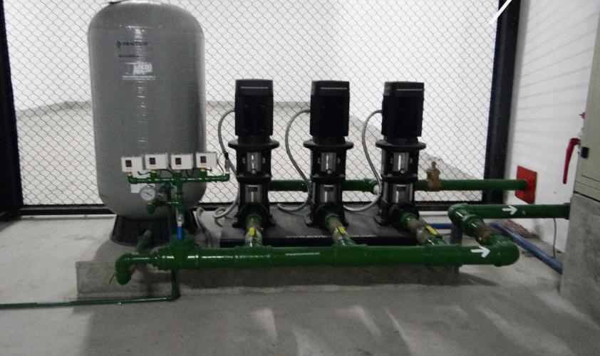 El sistema está conformado por tres bombas verticales multietapas Grundfos modelo CR20-3 de 7,5 HP cada una, integradas a un tablero de presión constante con variador de frecuencia (VDF), lo que permite que la operación trabaje en función de la demanda real del sistema, optimizando desempeño y consumo energético.
